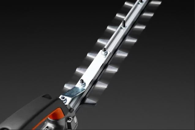 Long reach for increased capacity. The cutter bar can be set at various angles to the shaft, so you can cut the top while standing on the ground. |