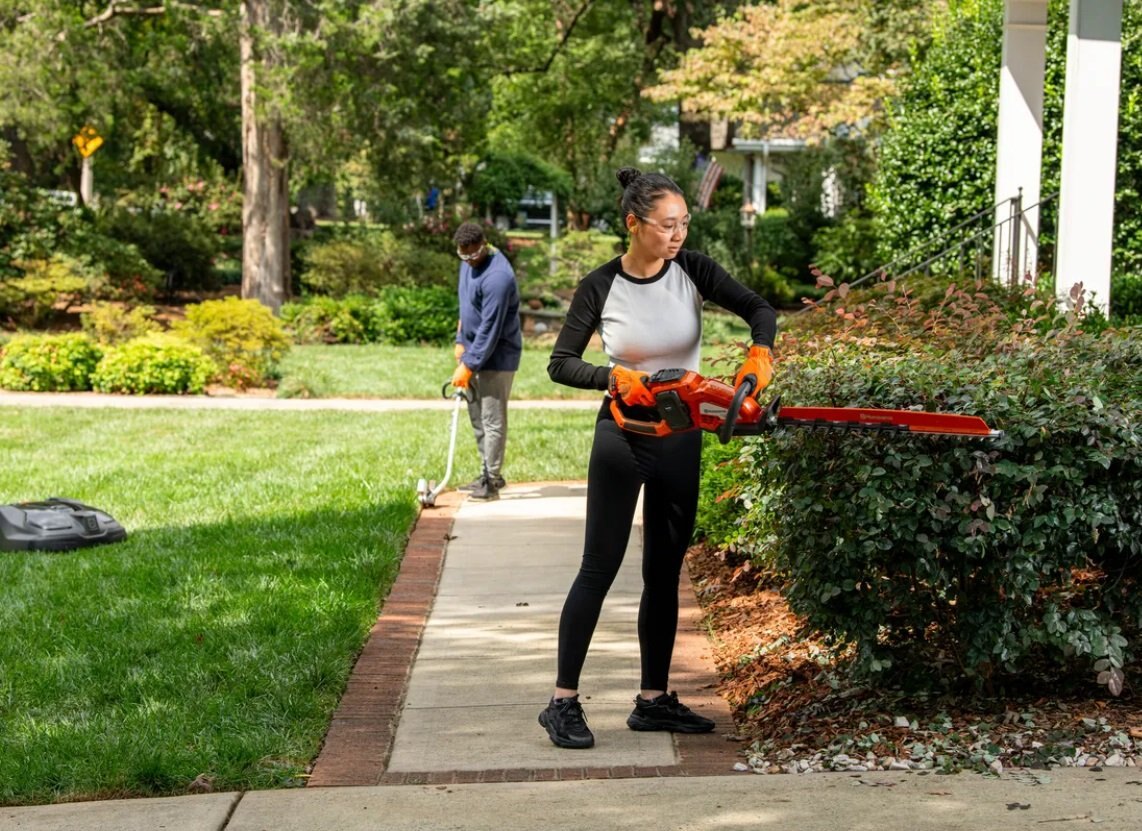 Deliver 30% more reach* for increased comfort and control *When compared to the leading competitor’s 56V hedge trimmer with 25-in steel blade that does not include tri-handle grips. |