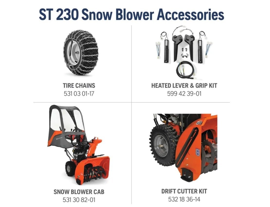 Quickly clear any winter weather with the Husqvarna ST 230. This snow thrower uses a two-stage clearing system to easily churn through wet or frozen snow. It's easy to use, with an adjustable handle and power steering. And X-trac heavy-tread tires provide increased traction on slippery ground. |