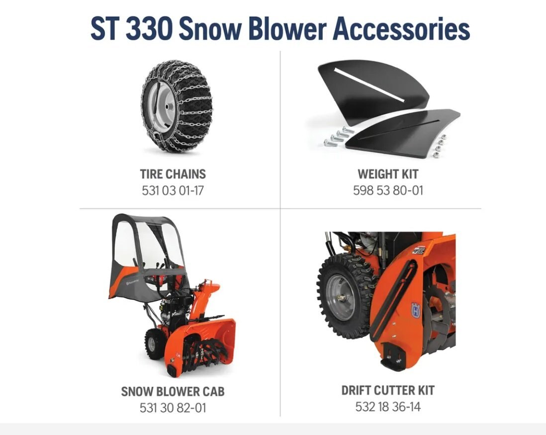 Send snow flying with the Husqvarna ST 330. This snow thrower uses a two-stage clearing system to easily churn through wet or frozen snow. And X-trac heavy-tread tires provide increased traction on slippery ground. With instant key starting and power steering, this machine is easy to use and the heated handle grips will keep you comfortable all winter long. |
