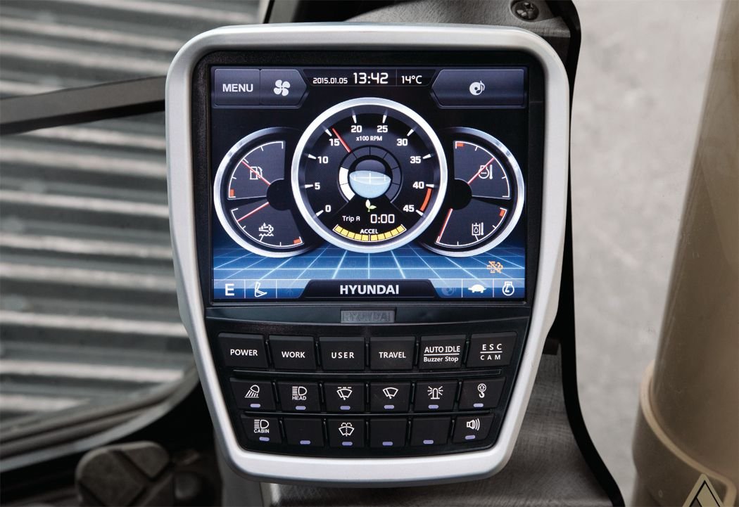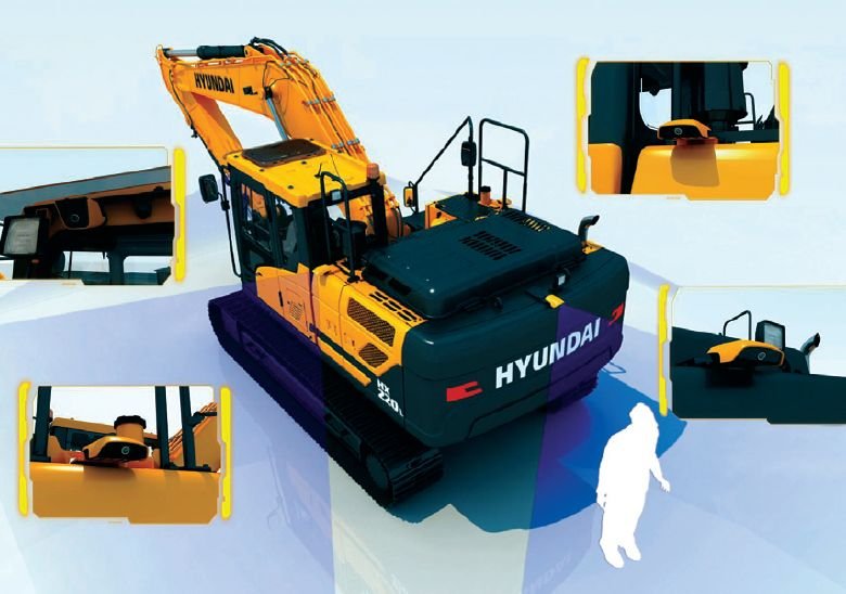 The Hyundai-exclusive AAVM video camera system provides the operator a 360-degree field of view on the monitor, which greatly contributes to work site safety. Part of this system includes IMOD (Intelligent Moving Object Detection), which alerts the operator to the presence of people or objects within a 5 meter (16 ft) range of operation. |