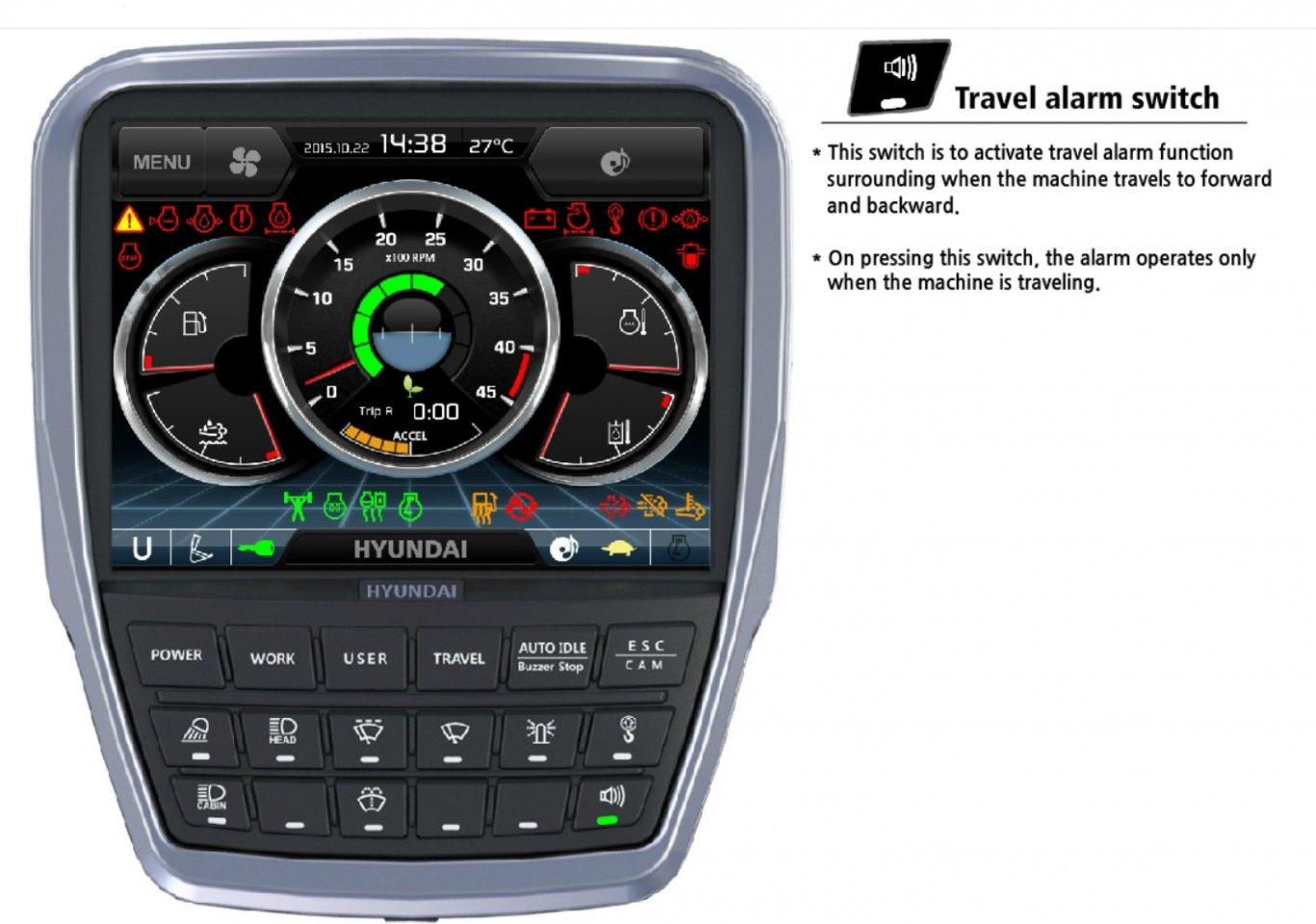 An auto-travel alarm will sound as soon as travel is engaged forward or reverse. This standard safety feature greatly increases job site safety by alerting workers around the machine. This alarm may be deselected by a convenient switch. |