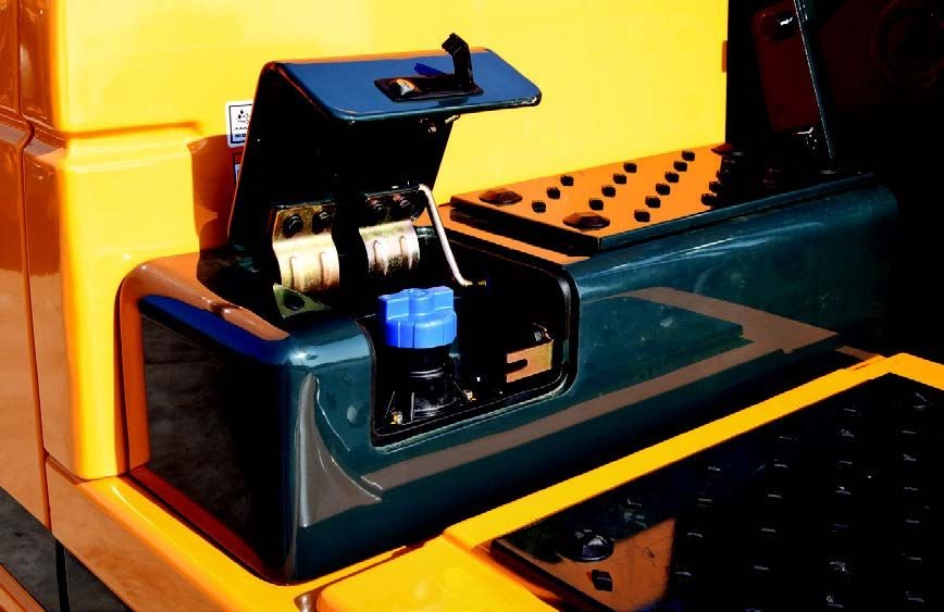 The DEF/AdBlue® tank is installed next to the tool box. Its inlet is remotely located for easy access and convenient supply. A red lamp signal warns of overfill. The DEF/AdBlue® supply module is attached on the side of the fuel tank for easy maintenance and filter replacement. |