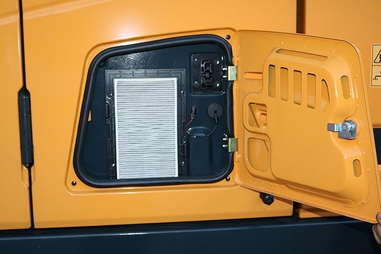 Cab air filter is conveniently accessible from ground level by way of a lockable door on the cab. |