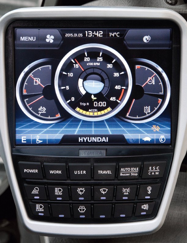 The Hyundai-exclusive AAVM video camera system provides the operator a 360-degree field of view on the monitor, which greatly contributes to work site safety. Part of this system includes IMOD (Intelligent Moving Object Detection), which alerts the operator to the presence of people or objects within a 5 meter (16 ft) range of operation. |