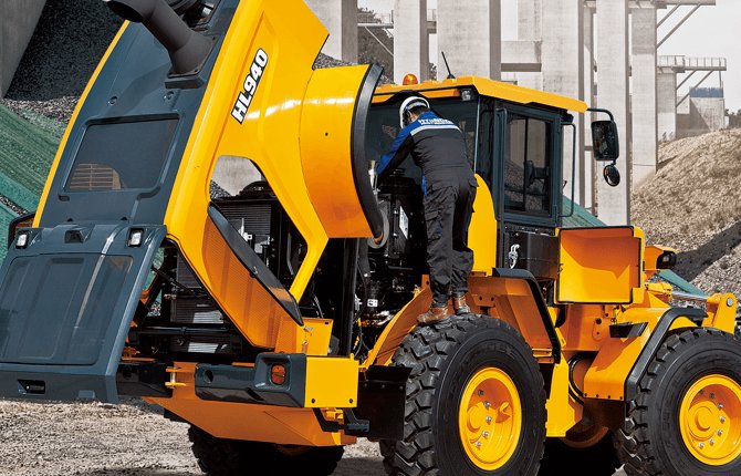 The HL900 series has improved accessibility to the sealed engine room with a tilt-back hood to allow for easy cleaning and maintenance. The engine compartment was designed to prevent any possibility of fire due to contamination. The wide open access when the hood is open also enhances serviceability of the engine and cooling room. New serviceability features in the new A-Series include a Fully Openable Engine Hood. |