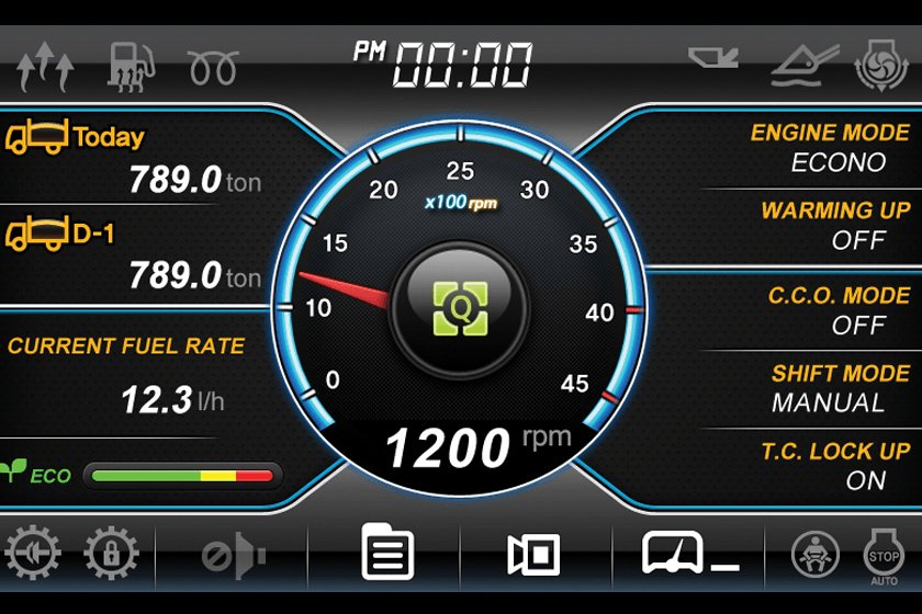 Using the Eco Gauge function, operators can monitor fuel consumption in real time or review historical data. Displayed values include engine torque, fuel efficiency, average and total fuel consumed. Hourly and daily fuel consumption also are viewable through the menu. A-Series models now include a new Eco Report feature, Smart Power mode that can adjust engine RPM in heavy load work, and ICCO (Intelligent Clutch Cut Off) to save fuel without compromising on performance. |