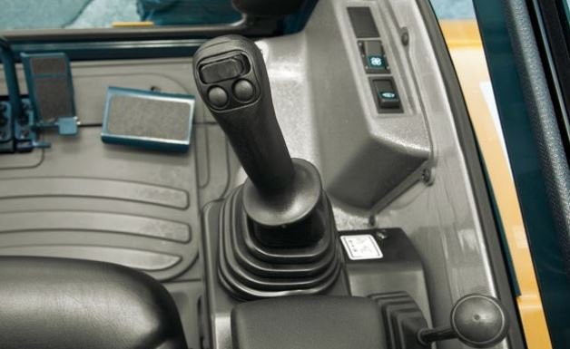 A tiltable left-side console allows the operator easier access to the cab. A safety lock system is designed to prevent exiting the cab while hydraulic controls are live. When the safety lever and left side console are positioned upright, hydraulic functions are disengaged.
