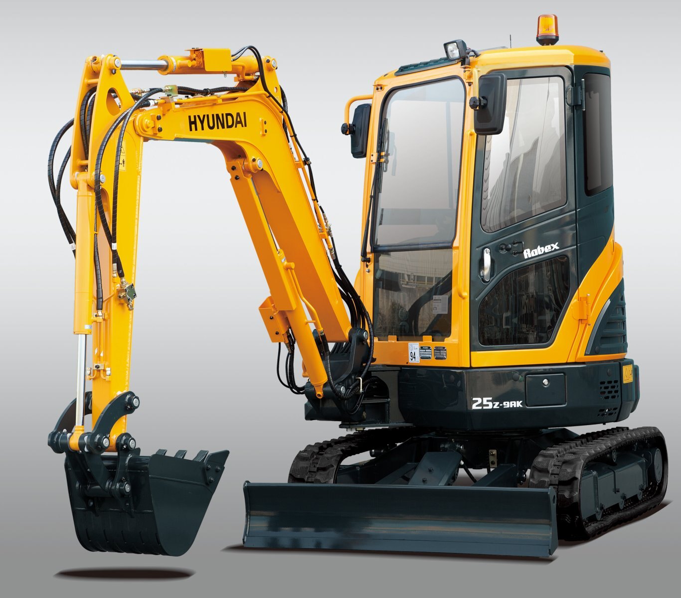 Hyundai's R25z-9AK is tested in accordance with stringent ISO standards. The canopy features a reinforced steel pillar design that complies with TOPS (turn over protection system) and FOG (falling object guard) level 1 ISO standards.