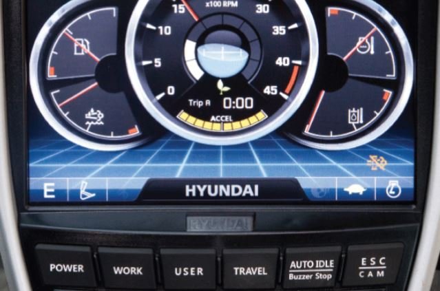 The Hyundai-exclusive AAVM video camera system provides the operator a 360-degree field of view on the monitor, which greatly contributes to work site safety. Part of this system includes IMOD (Intelligent Moving Object Detection), which alerts the operator to the presence of people or objects within a 5 meter (16 ft) range of operation.
