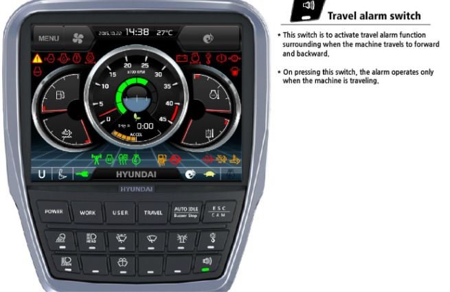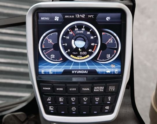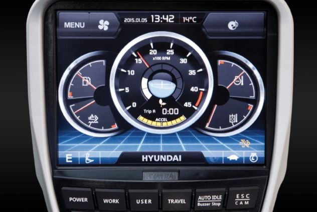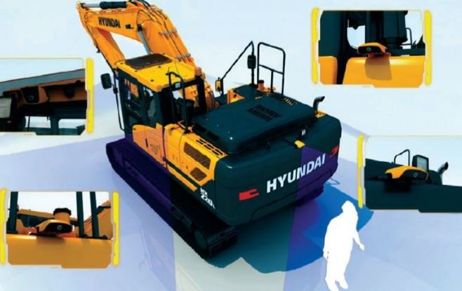 The Hyundai-exclusive AAVM video camera system provides the operator a 360-degree field of view on the monitor, which greatly contributes to work site safety. Part of this system includes IMOD (Intelligent Moving Object Detection), which alerts the operator to the presence of people or objects within a 5 meter (16 ft) range of operation.