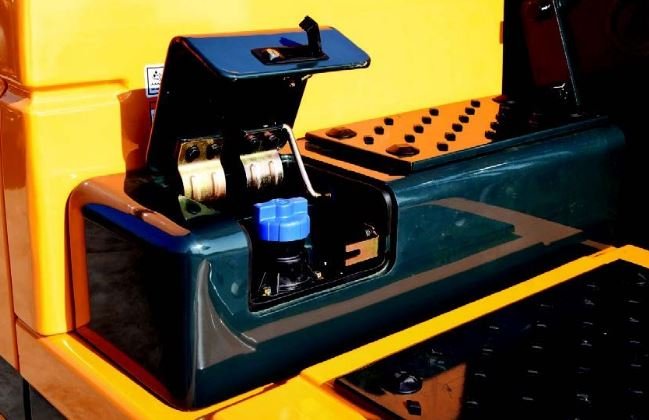 The DEF/AdBlue® tank is installed next to the tool box. Its inlet is remotely located for easy access and convenient supply. A red lamp signal warns of overfill. The DEF/AdBlue® supply module is attached on the side of the fuel tank for easy maintenance and filter replacement.