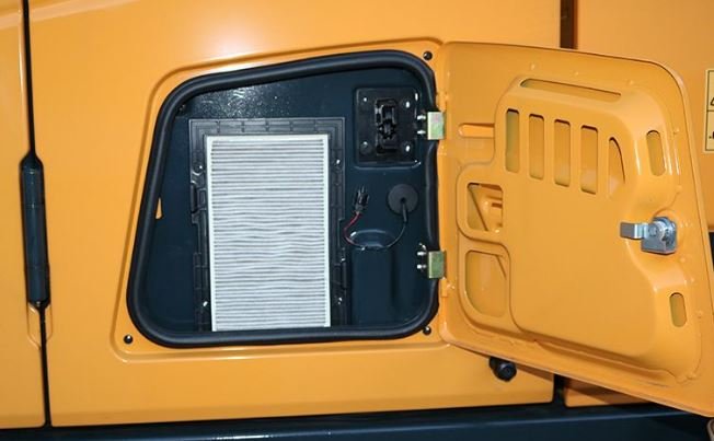 Cab air filter is conveniently accessible from ground level by way of a lockable door on the cab.