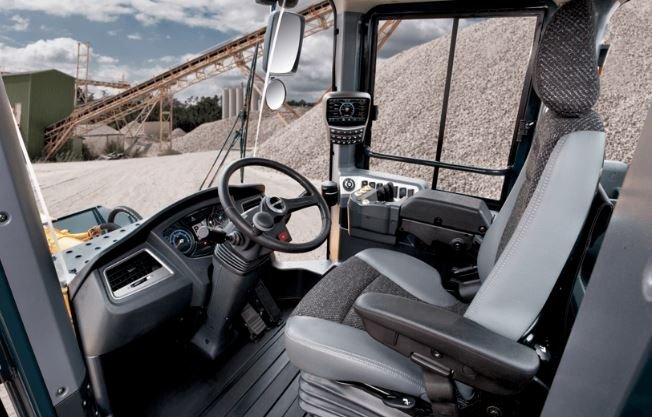 The cab is equipped with features that enhance operator productivity, including a larger 7” (177 mm) interactive touch-screen monitor, optional fingertip controls, fully adjustable and heated air-ride seat, and centralized control switches for added convenience.