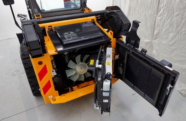 Ready access to the rear of the machine is made possible with wide, easy-opening rear door. The radiator module swings out, too, providing full access to the engine compartment, hydraulic filter, and other key components.