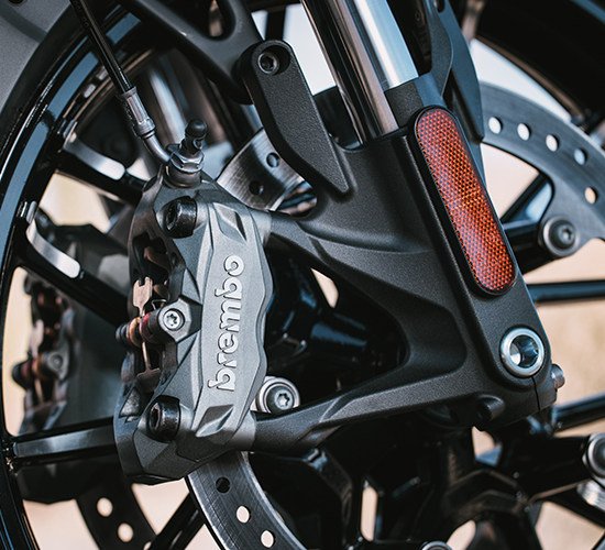 Inverted front forks and radial Brembo® brakes combined with dual rotors are designed to turn power into great handling and confident stopping. |