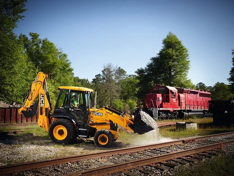 Dymax Rail System For Backhoe Loader JCB backhoe loaders are suitable for a wide-range of rail industry applications, and with the largest swing cylinders in the industry, producing18,000 lbf-ft of swing torque, JCB backhoes are the ideal machine for replacing railroad ties. |