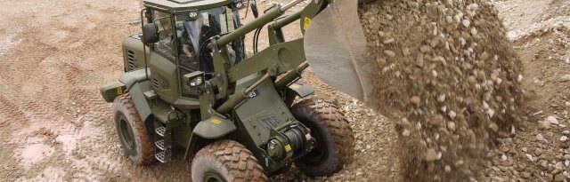 The cab is fully air-conditioned, comfortable and ergonomically designed, with 24-volt systems and seat-mounted excavator controls. The Military Wheel Loader can be waterproofed up to a 5 ft. wading depth, can be winterized to -40° and is available in a variety of specialty paint finishes. Convoy and blackout lighting is available, with lifting points, tie-down points and reduced height cabs for ease of transport.