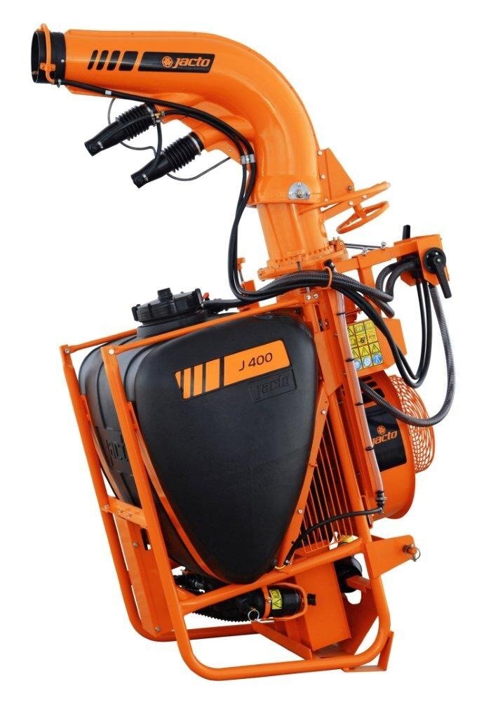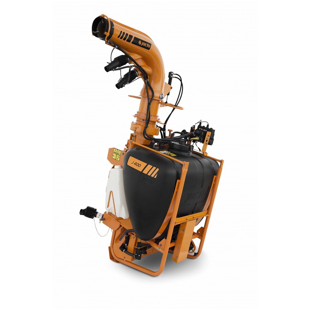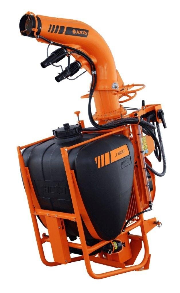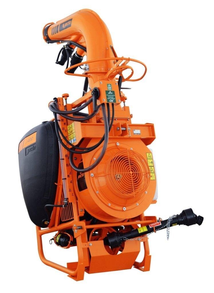 The J400 series has the same 105 gallon capacity and Jacto centrifugal pump as the AJ401, but with a larger fan with higher CFM and discharge speeds. A completely different outlet duct assembly with main outlet and two smaller directional intermediate ducts lets you achieve spray swaths up to 80 feet, depending on the crop and wind conditions. The specially designed Cannon head is easy to operate and can be adjusted horizontally up to 290 degrees and vertically by 34 degrees. Three versions are available, the standard J400 with manually adjusted outlet duct, the J400CHT with hydraulic duct control and J400CHT/EL with electric control valve from the factory. If you choose the J400CHT or J400CHT/EL models you must have two open sets of remotes for the hydraulic hoses to be plugged into. Popular applications are vegetables, especially pumpkins and sweet corn, blueberries, Christmas trees as well as container and tree nurseries. |