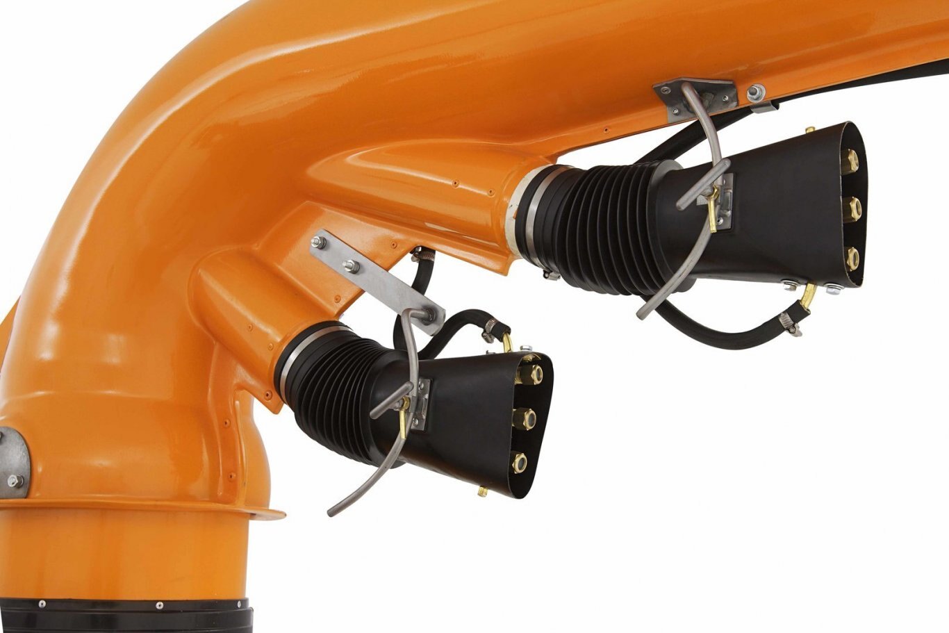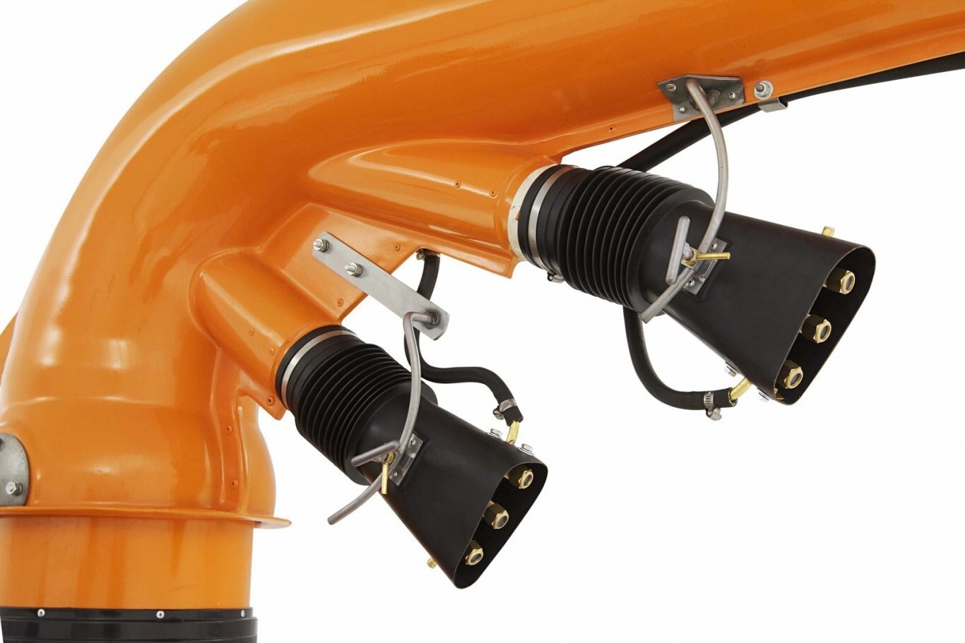 Optional duct extension kit. In crops such as highbush blueberries, certain varieties of sweet corn and taller nursery or nut trees, it may be desirable to add the 39 or 78 inch duct extension. These extensions mount to the top of the fan housing before the outlet duct to raise the whole assembly. This higher mount allows you to achieve proper spray angles across, down and through the crop. |