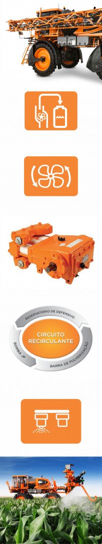 Hydrostatic transmission system 4x4 with intelligent control of traction, integrated to the diesel engine of 243 hp and distribution of ideal weight between the axles, allows to spray in the most different types of terrain; the system automatically identifies the need for traction control in the vehicle without the need for the operator to act; more comfort and precision in the spraying operation; exclusive braking system with hydraulic ABS control integrated into the transmission system; more safety in the operation of the equipment with comfort and precision in the spraying operation, reducing fuel consumption. |