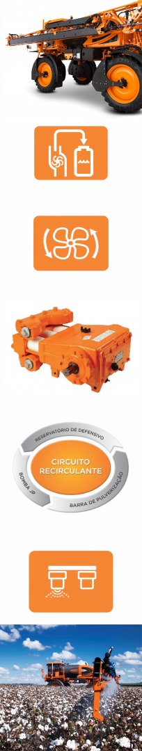 Can operate at speeds of up to 21.7 mph in the spraying operation and 34 mph in transport; equipped as standard with the exclusive Unitrack steering system allowing to work with a 35% smaller turning radius; reduces maneuvering crop dents by up to 40%; 2.5 times faster than the conventional system; increase in treated area by up to 10%; a set of solutions that allow daily operating income to reach up to 2879 acres per day, the trapezoidal hydraulic suspension boom stability system adapts to different types of terrain; a sensor system in conjunction with the hydraulic damping system allows the operator to choose the correct damping level for the boom system, adapting the boom stability to the terrain profile; it has the exclusive feature of the operations copier that allows to optimize and standardize the spraying operations in a simple and agile way. |