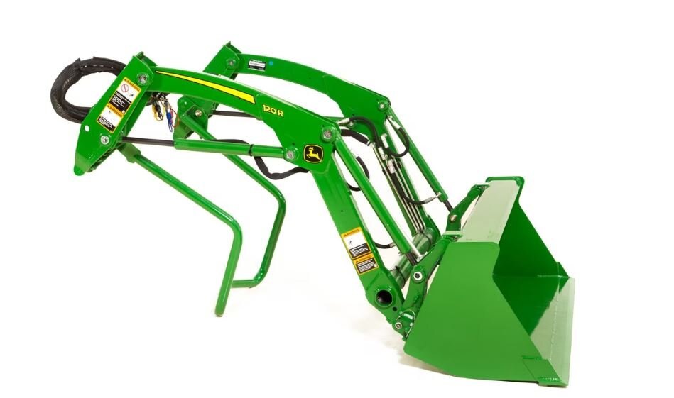 The Quik-Park mounting system on the 120R Loader is designed for easy removal and mounting to and from the tractor without tools. Just like on the former H120, the parking stand is attached to the mast. To lower it into the park position, simply move the joystick to the raise position once the latches are opened.