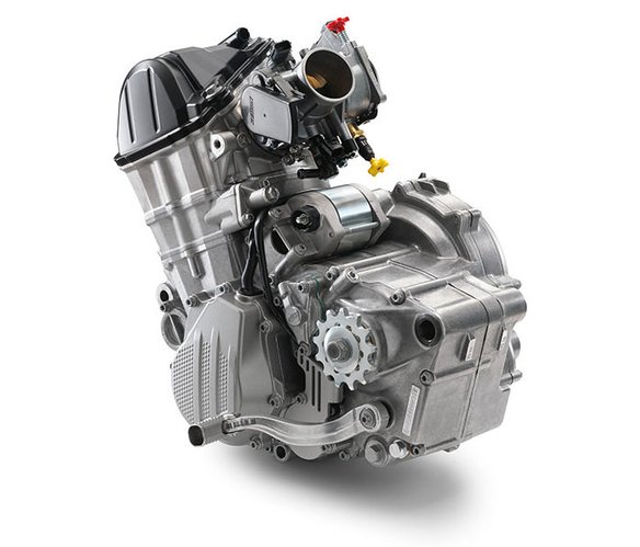 The 450 cc engine is the ultimate powerhouse when it comes to KTM's competitive motocross range. Its compact, lightweight design features a single overhead camshaft cylinder head, fueled by a highly advanced electronic injection system. This enables the impressive power to be distributed extremely efficiently throughout the rev range. Even with its super-beneficial electric starter, this model is still the lightest 450 cc engine on the MX market. |