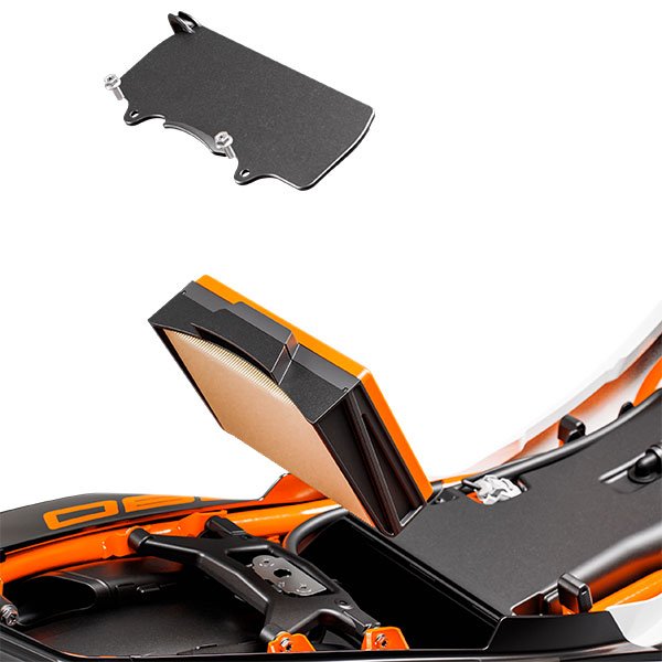 The KTM 890 ADVENTURE features easy air filter accessibility for cleaning and servicing, even if you're out in the most remote location while on a ride. The airbox is located under the seat with the intake at the rear of the bike. This means that in addition to easy air filter access, the seat and tank could be kept low and the bike could be made narrower where it counts: in the leg area. It has also allowed better positioning of the electronics to keep mass centralized. |