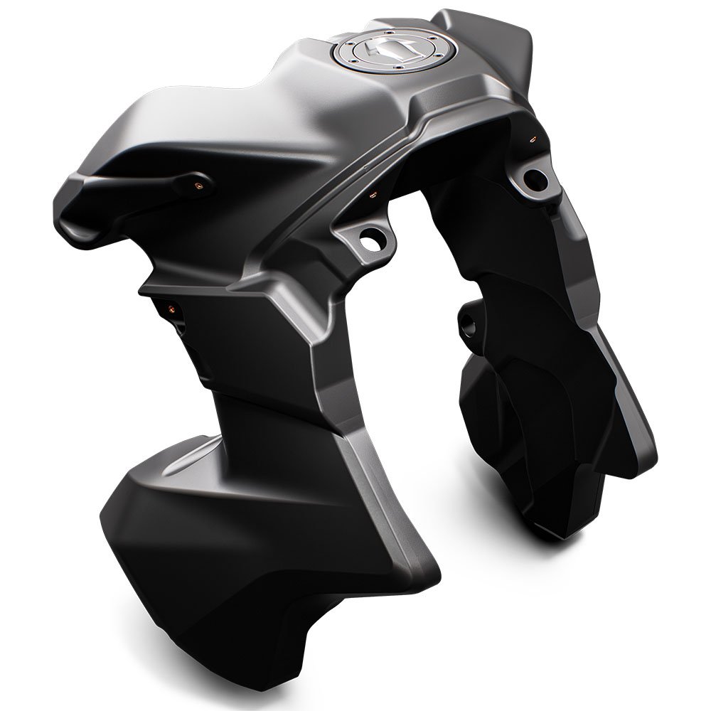This groundbreaking fuel tank concept is central to the 890 ADVENTURE R's design innovation. With the main tank volume placed as low as possible and slung down the sides of the chassis, it provides many benefits. Whether seated or standing, the tank between your legs feels considerably narrower and more compact than one would expect from the generous 20 liter volume. The low-slung fuel volume results in effortless handling with the bulk of the weight set low and forward, eliminating the fuel swaying and offsetting the balance as is typical of traditionally-positioned tanks. This results in a low center of gravity which enhances agility and allows for more playful handling and instant change of direction. The freed-up traditional tank area allows a straighter and lower seat, giving the rider more freedom to move with improved freedom. The tank is also made of highly durable materials and is highly crash-resistant, as proven by the similar tank concept successfully used in the extreme race conditions of the Dakar Rally by the KTM Factory Racing team. The ultimate result is a best of both worlds: a slim feel of a smaller offroad bike with the exceptional fuel range of over 400 km on the open road. |