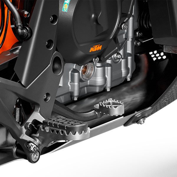 Whether it's all-day riding while standing or sitting, the KTM 890 ADVENTURE R 's strong footpegs have been developed for superior ergonomics and to accommodate street or offroad boots in a wide range of conditions. The footpegs have rubber inserts for added comfort, which can be removed for a more offroad feel. |