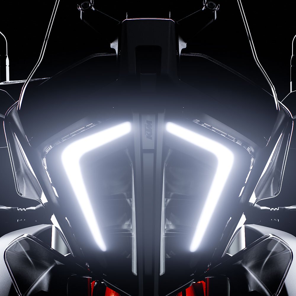 LED lights are used on the KTM 890 ADVENTURE as the main headlight, taillight and indicators. LED lights offer great illumination and visibility. The design of the headlight mask was inspired by the KTM 450 RALLY motorcycles, providing improved visibility and reducing the overall volume of the cockpit when attacking offroad terrain. |