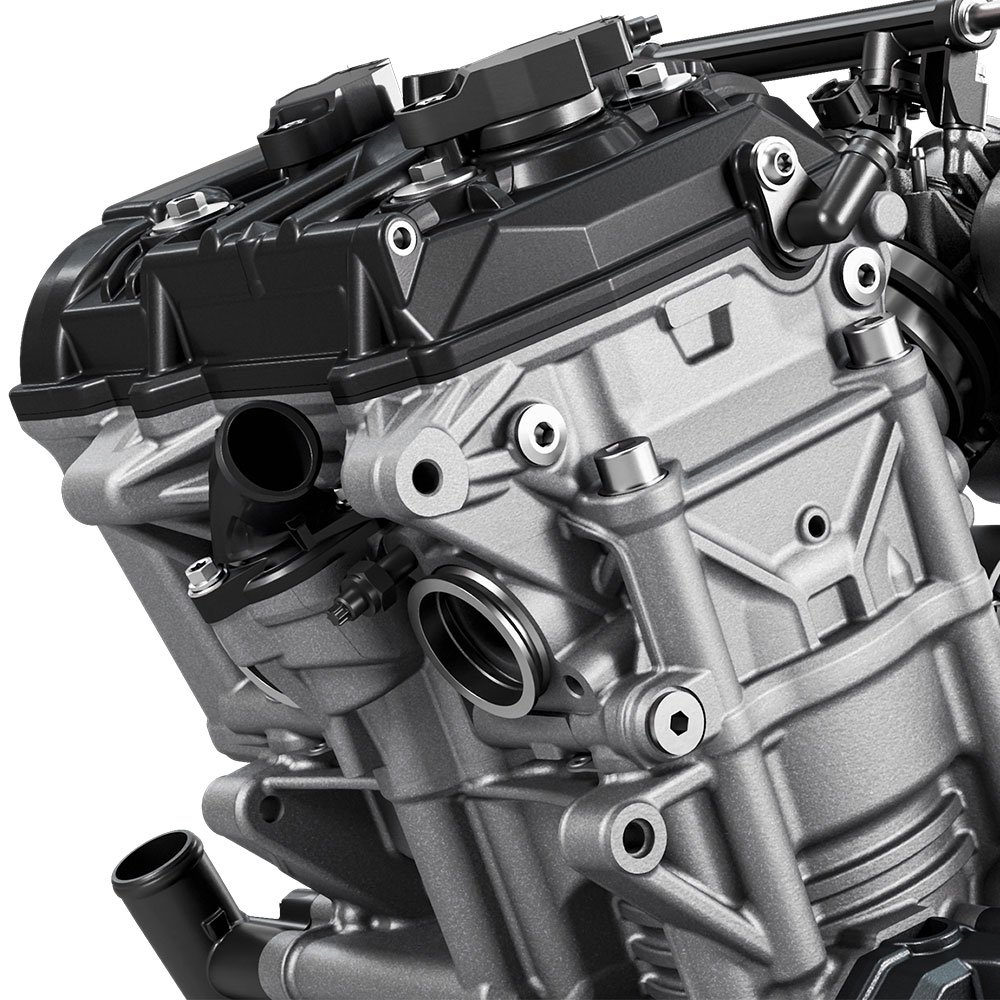 Lighter, forged box pistons with three piston rings connected by a plain conrod bearing, combine with a DLC coated piston pin for reduced piston weight and less reciprocating mass. Piston cooling is also taken care of by two jets per piston, instead of the previous one per piston. The rotating mass of the crankshaft has been increased by 20% for improved engine behavior at constant speed. In addition, it is beneficial for cornering stability without losing the agile riding feeling. |
