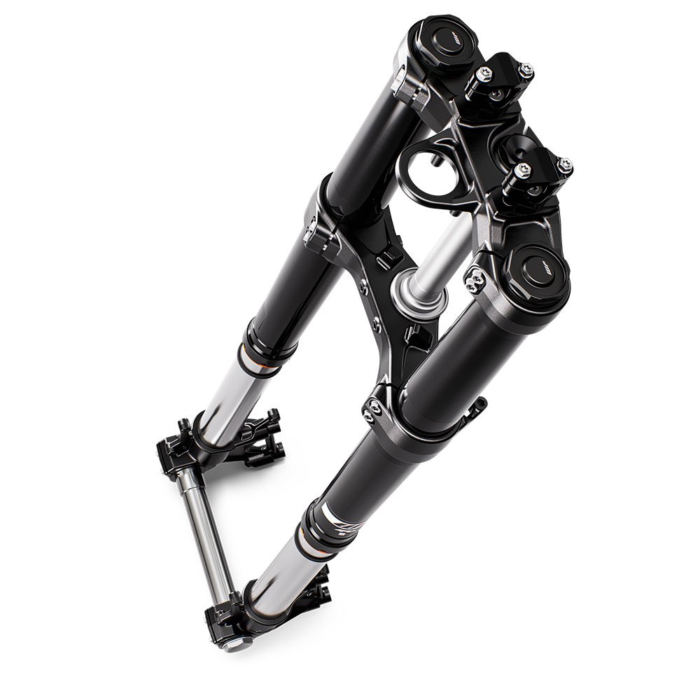WP APEX 43 mm open cartridge upside-down forks take care of the rough stuff upfront, striking the perfect performance balance between offroad adventure riding and two-up sport touring. Split function technology separates the compression and rebound damping between the two fork legs, allowing the generous 200 mm of travel to take care of the big bumps. |