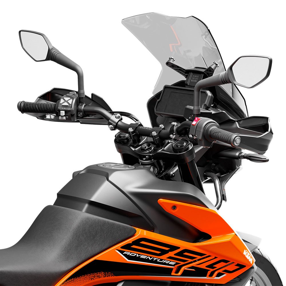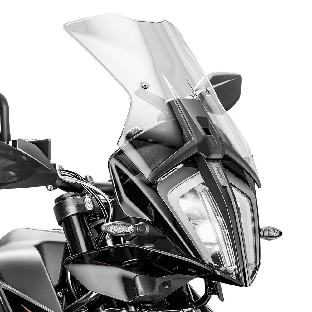 The KTM 890 ADVENTURE has a high windshield for maximum wind protection on long rides when chewing up kilometers at high speeds on the open road. The lower KTM 890 ADVENTURE R windshield can be used on the KTM 890 ADVENTURE for a racier look. |