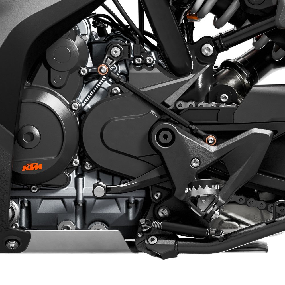 The 6-speed sequential gearbox gets faster shifting thanks to shorter shift lever travel, lighter spring action and quicker Quickshifter+ technology, while the teeth on 4th, 5th and 6th gear are glass bead blasted for improved reliability. Quickshifter+ - optional on the KTM 890 ADVENTURE - allows for clutchless up and downshifts throughout the rev range. |