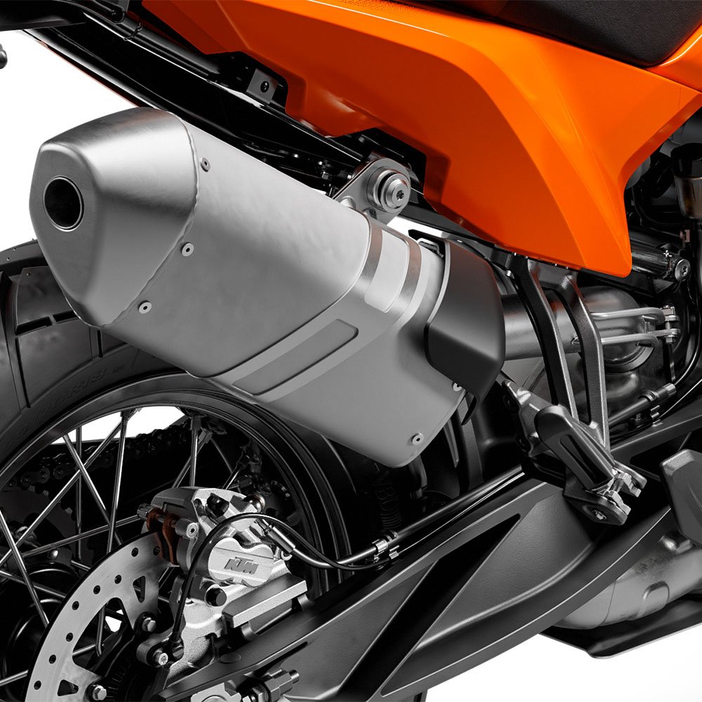 Stainless-steel and ready for adventure! The exhaust system on the KTM 890 ADVENTURE boasts a reworked pre-muffler with an efficient catalytic converter to meet the latest emission limits. The whole design is focused on centralizing masses, which also improves the exhaust system's ground clearance. |