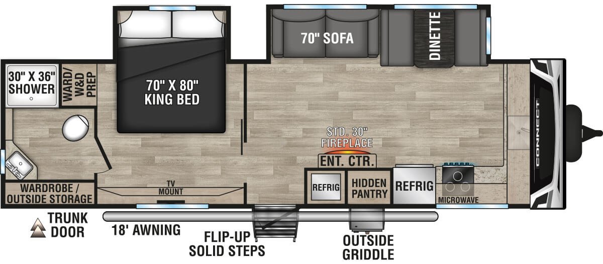 Connect is modern and sleek with an affordable price tag! It comes standard with a king-size bed, residential-size kitchen, and entertainment center.
