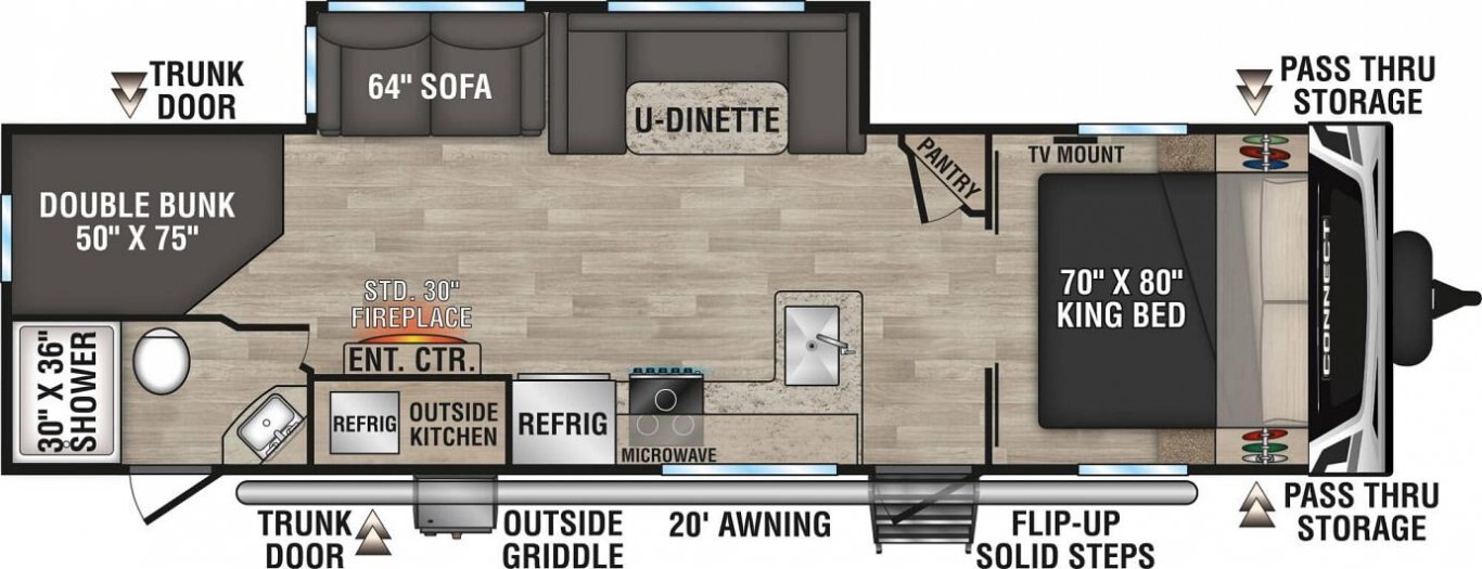 Connect is modern and sleek with an affordable price tag! It comes standard with a king-size bed, residential-size kitchen, and entertainment center.