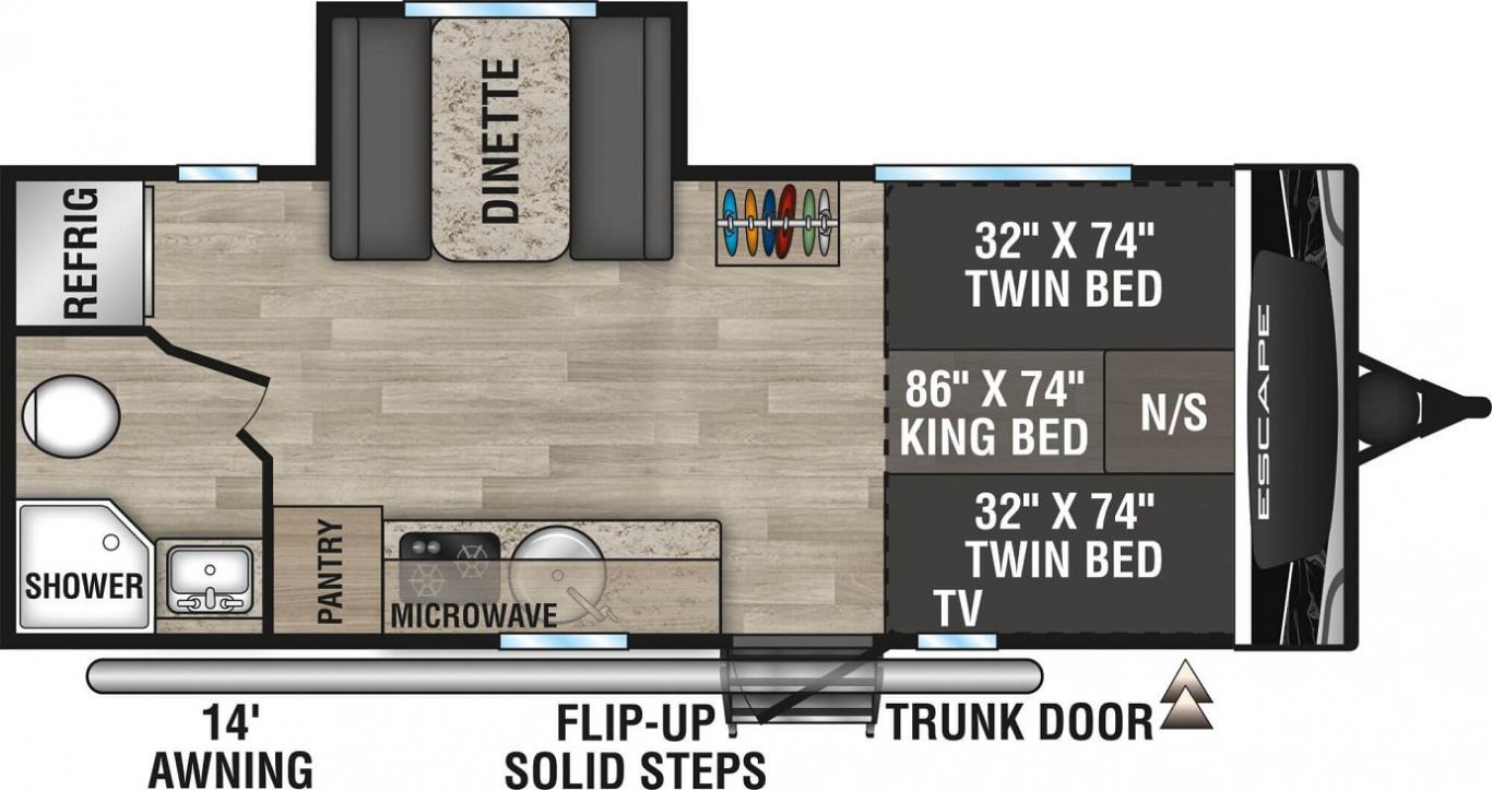 The ultimate adventurer’s RV, Escape is built for campers who want to have some fun. Starting at just over 18' feet and 3,000 pounds, Escape is ready for your next getaway!
