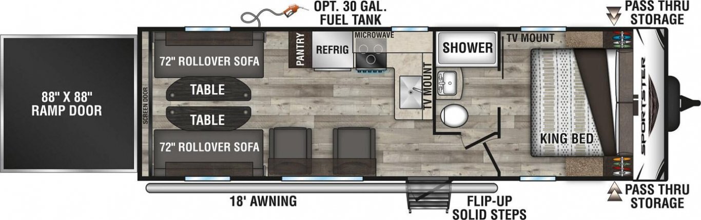 Sportster toy haulers are for those looking to have a little more fun! The Sportster allows you to take your favorite toy anywhere. If you’re looking for some serious entertainment, the Party Patio Package adds extra outdoor space to entertain guests!
