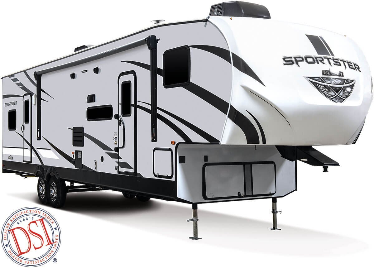 Sportster offers travel trailer floorplans with weights ranging from 6,600 to 8,070 and lengths from 30' 8" to 35' 10".
