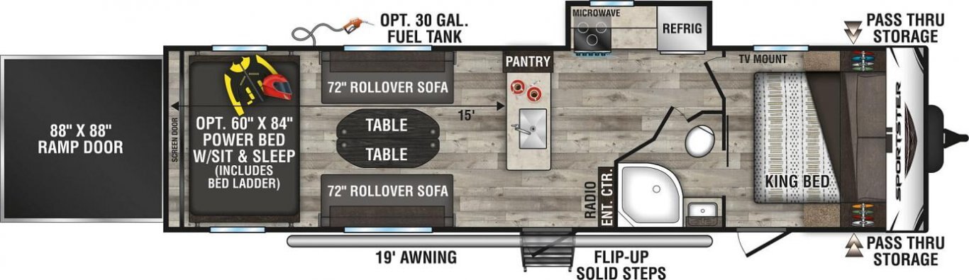 Sportster toy haulers are for those looking to have a little more fun! The Sportster allows you to take your favorite toy anywhere. If you’re looking for some serious entertainment, the Party Patio Package adds extra outdoor space to entertain guests!