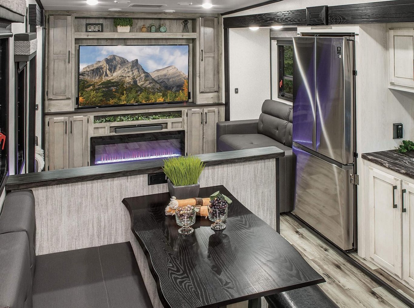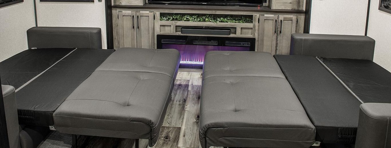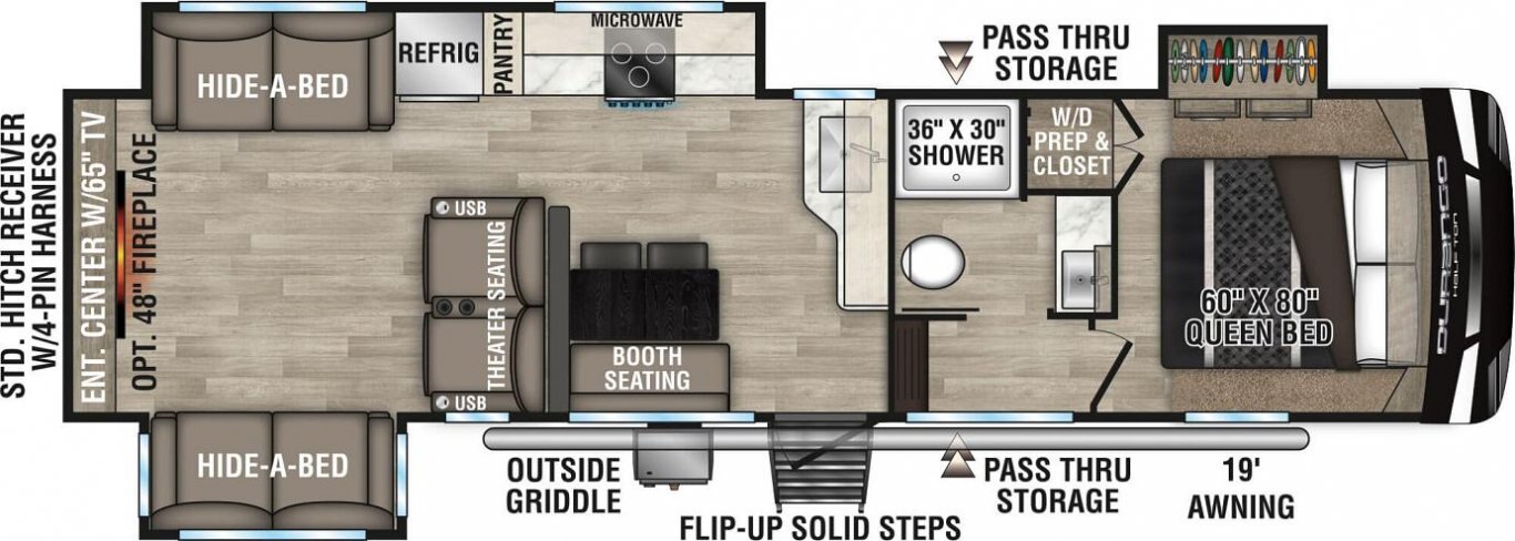 Durango Half-Ton is where lightweight travel meets fifth wheel amenities. Rest and enjoy all the comforts this RV has to offer, from the modern interiors, optional electric fireplace, and additional outdoor kitchen area (select models).