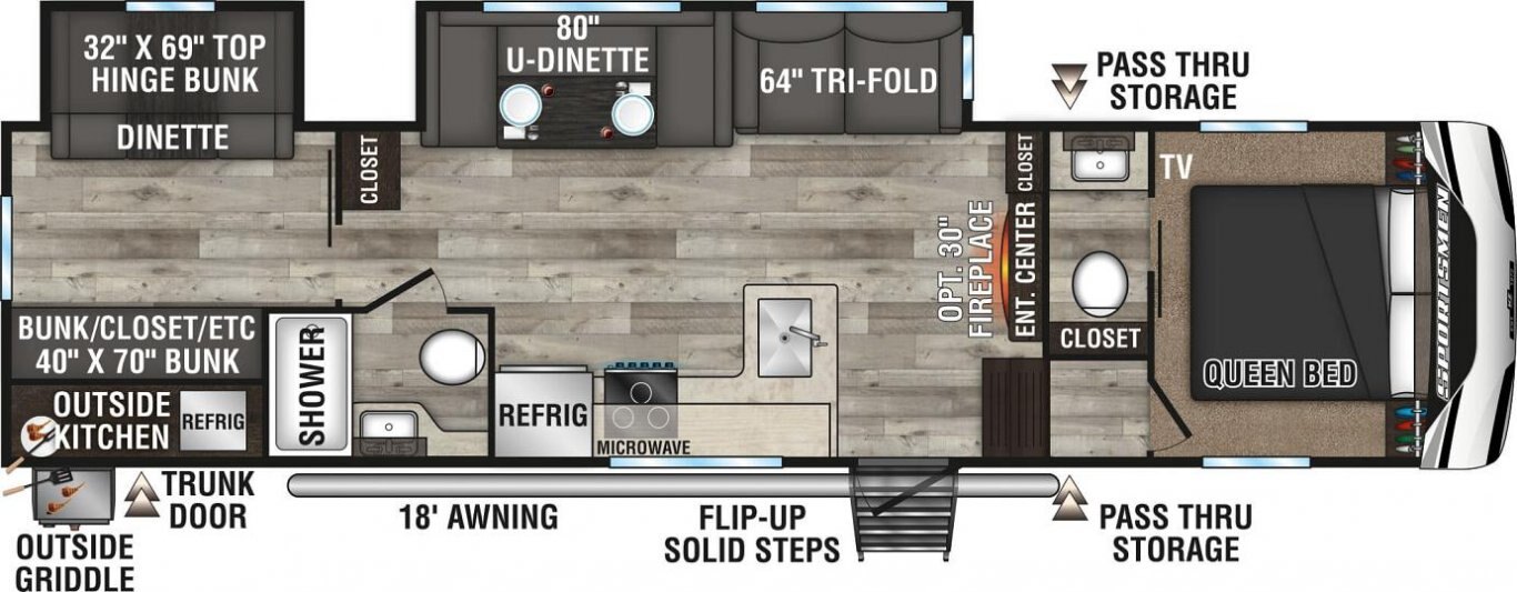 Starting at just 6,200 pounds and over 24' long, Sportsmen is where utility and comfort meet. Optional features like the outdoor griddle and fireplace will only upgrade your recreational lifestyle.