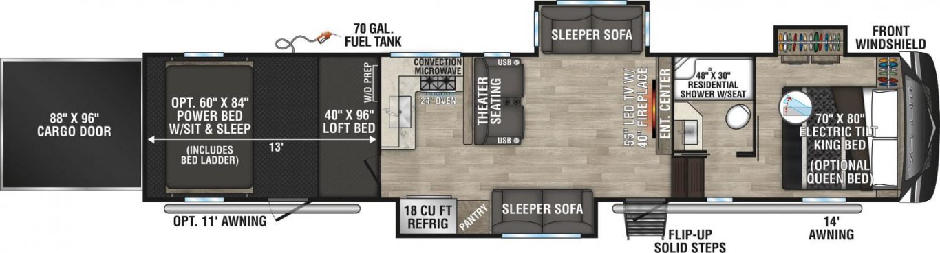 Venom is available in four floorplans, all featuring power beds and loft beds. You’ll be sure to relax in comfort and style no matter where you are!