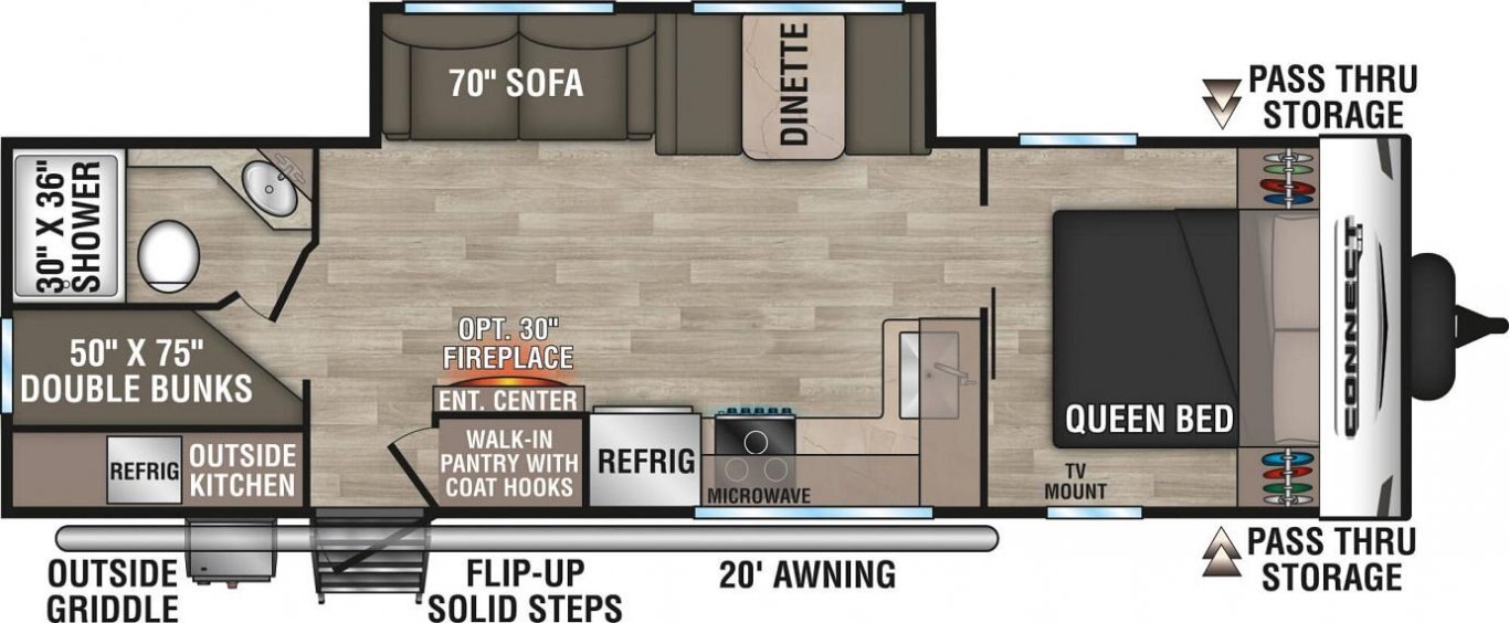 Enclosed Dump Valves & Water Lines 42,000 BTU Tankless Hot Water Heater Roof Ladder Solar Roof Prep Exterior Docking Station: Fresh Tank Fill, Outside Shower & Cable Hookups White Exterior Fiberglass Flip-up Entry Step (main entry) Full Glass Friction Hinged Entry Door w/Shade Prep, Screenshot & Screen Defender Power Front Jack Key-Alike Program for Baggage & Entry Doors Magnetic Catches for Baggage Doors Folding Grab Handle Exterior Speakers Spare Tire & Carrier Backup Camera Prep Goodyear Nitrogen-Filled Tires Battery Disconnect Switch Climate Package (heated, insulated & enclosed underbelly) Outside Kitchen (select models) Leash Latch w/Bonus Beverage Opener |