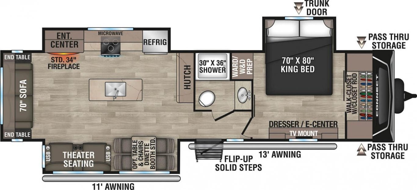 Connect is modern and sleek with an affordable price tag! It comes standard with a king-size bed, residential-size kitchen, and entertainment center. |