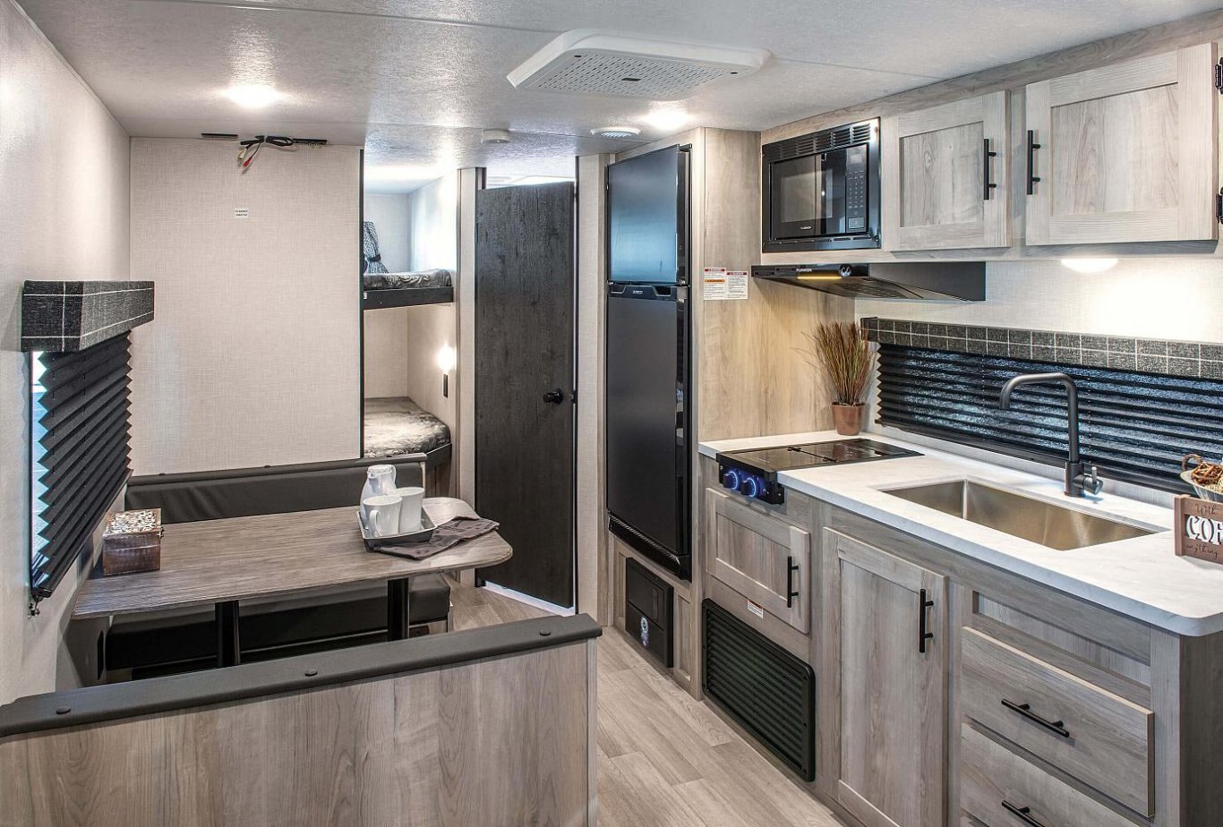 INTERIOR Residential Grade Linoleum 10 CU FT Refrigerator 12V w/Dual Temperature Control Black Residential Kitchen Faucet Interior Control Switches on Overhead End Cabinet w/Convenience Center for Switches Electric Outlet in Bunk Area Microwave