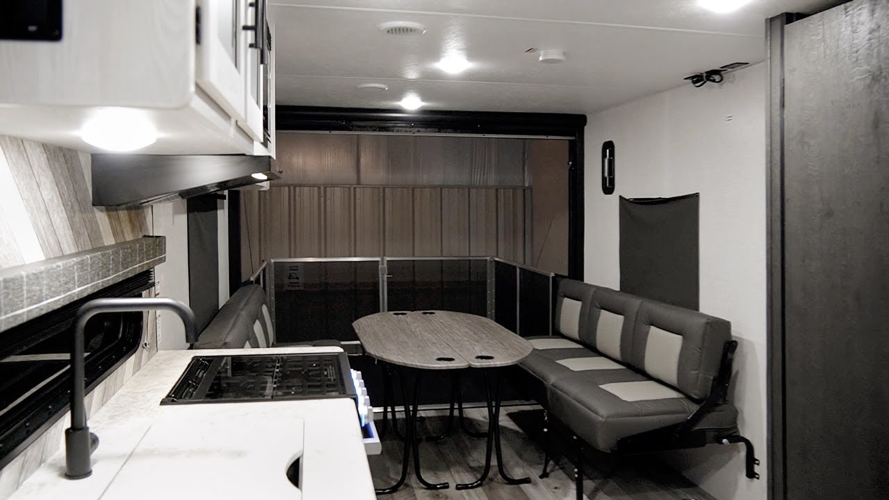 Power Vent in Bath Shower Surround Reversible Quilted Comforter Digital TV Antenna w/Booster 13,500 BTU A/C Water Heater Bypass Kit Large Overhead Cabinets Roller Ball Bearing Drawer Glides LED Interior Lighting Linoleum Throughout Monitor Panel 3-Burner Cooktop Range Hood w/12V Light & Exhaust Fan Microwave w/Turntable